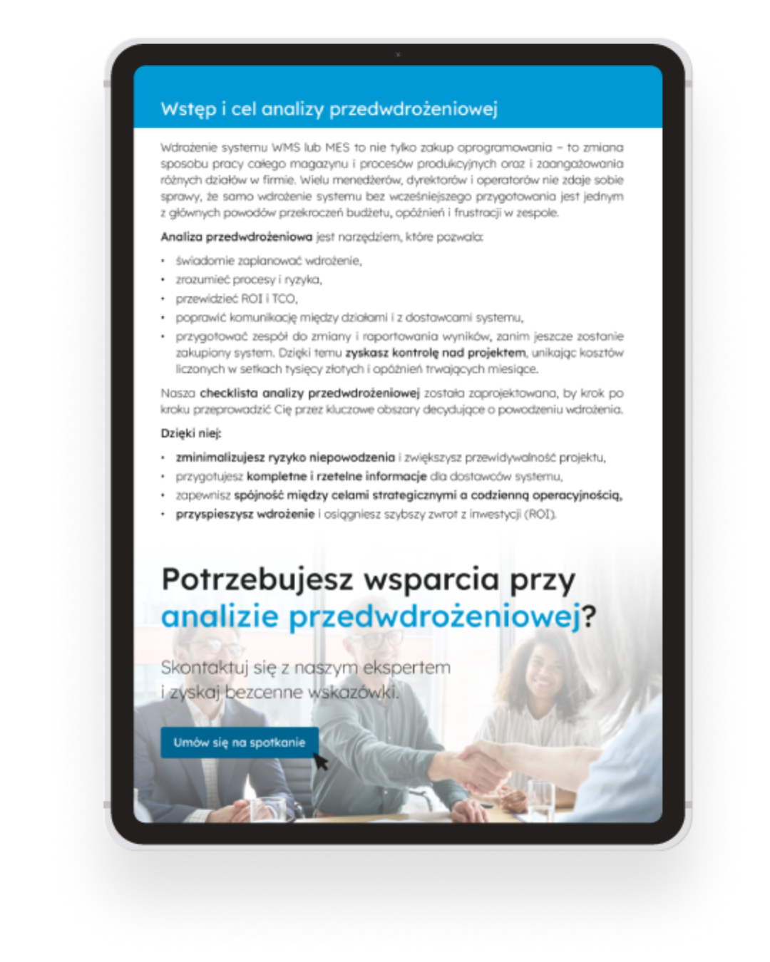 Pobierz poradnik „Analiza przedwdrożeniowa” oraz sprawdź, jak dobrze przygotować firmę do nowego systemu WMS. Dowiesz się, od czego zacząć, co ustalić na początku i jakie decyzje naprawdę mają znaczenie przed podpisaniem umowy.